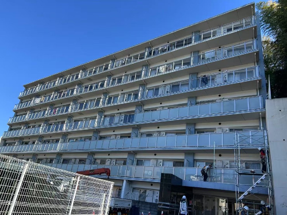 入居者の方への安全を最重視し、作業性の考慮もふまえて、最良の仮設プランを計画します。建物の外周は透過性のあるメッシュシートで覆い、工事の埃や塗料等が外部に飛散しないようにします。また建物の出入り口部分には居住者の方々が安全に出入り出来るようにガードを行います。